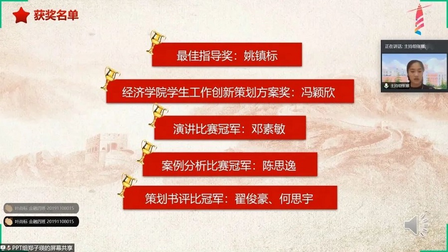 莅临本次表彰大会的嘉宾有经济学院党总支书记张雪梅书记、团委书记巫进娣老师、学生会指导老师何锡智老师、艺术团指导老师张素平老师、以及范英琦老师、冯羽老师、朱文艳老师、李慧茵老师、刘晶老师,18、19级全体学生干部。本次活动由干事张娜主持。