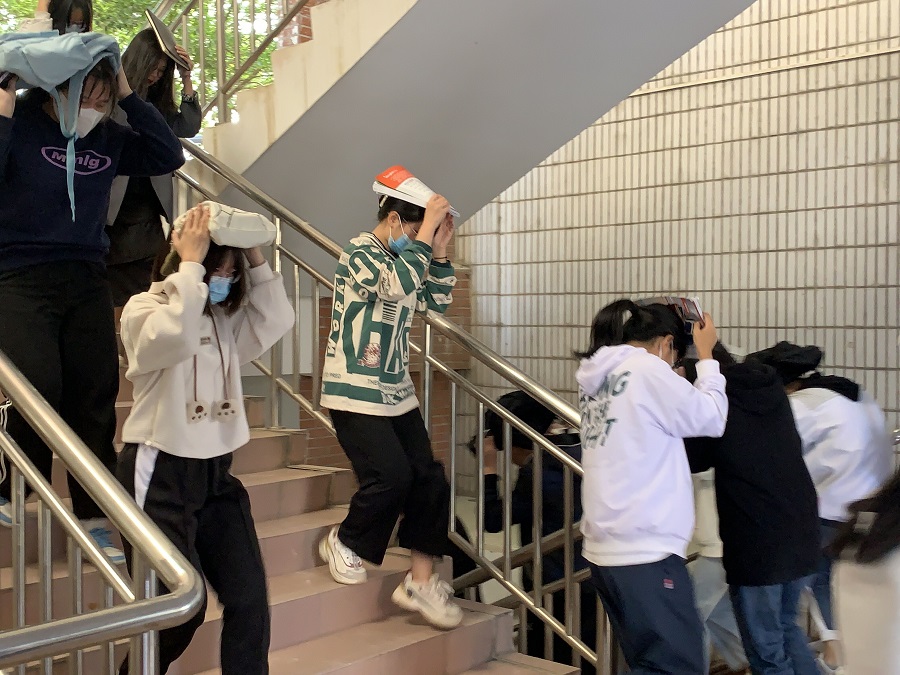 本次活动中,学生会指导老师杨芳淇详细讲解了地震应急安全教育知识和紧急避震时的躲避方法,50名学生代表充分了解地震时最佳的逃生路线和应急疏散的安全注意事项,以保证逃生演练时能迅速有序撤离到安全区域。本次地震演练分室内外两种情景模拟。在室内,同学们能够利用教室周围的环境做好自身的保护,通过老师的指导了解避震的正确方法从而更好地强化逃生技能。在应急疏散环节,同学们听到模拟警报声的响起,立即按照逃生路线迅速、有序地抱头撤离教学区域,转移到室外安全的空旷区域。