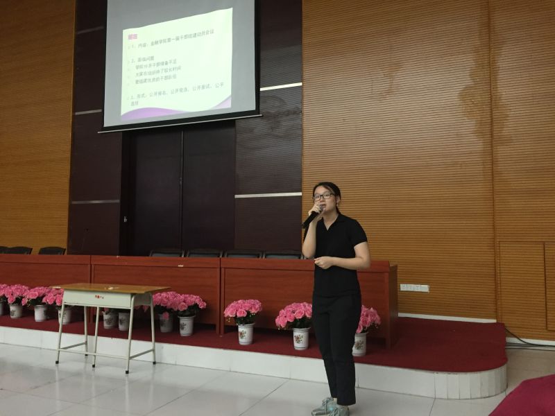 大会伊始,主持人陈紫晖发言。她首先提到了经济系分别成立金融学院和电子商务管理学院后学生干部力量储备不足,作为本次换届工作的学生代表,她积极呼吁在 座的干部同学能够积极参与到新队伍的组建中,并热烈欢迎大家加入到金融学院第一届干部队伍之中,为学院积极做贡献。叶剑敏也对大会作了一定的介绍,他对在场的三大组织干部、金融学院各级班委提出希望,希望在场的干部能为金融学院的往后出一份自己的力量。